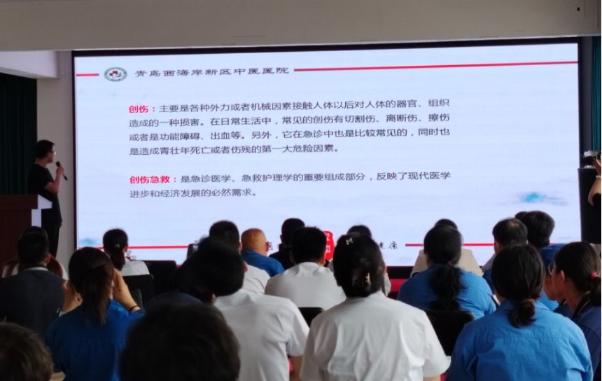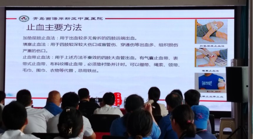 简单的开场介绍后,首先由中医医院的急诊科韩医生进行了常见的创伤方面的急救知识讲解,涵盖了止血、包扎、固定和搬运四项创伤急救技术。
